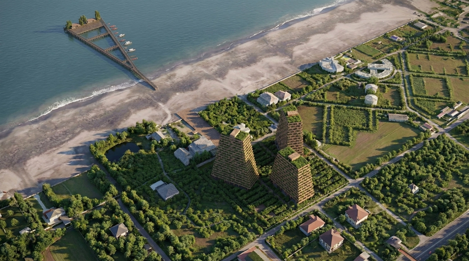 Kandooj Residential Complex is positioned at a critical confluence between the Caspian Sea and the Anzali Wetland, establishing the groundwork for a dual ecological living quality. The architectural concept is rooted in a contemporary reinterpretation of the archetypal kandooj structure and the vernacular roof forms of Gilan. The residential volume is elevated on independent supports, allowing uninterrupted natural cross ventilation while maintaining physical and visual continuity with the underlying tea garden landscape.